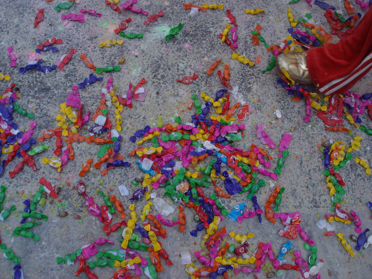 Outra tradição espanhola é no dia dos Reis, 6 de janeiro. Há desfiles pelas ruas de pessoas fantasiadas em cima de caminhões que vão jogando uma infinidade de balas e doces pro pessoal nas ruas. Lá estava eu no meu primeiro feriado. Toda empolgada, queria fotografar. Por isso, fui pra frente da multidão de gente, para ficar mais perto dos carros. Com uma mão na câmera e outra estendida para tentar pegar algumas das balas que eram jogadas em minha direção. Não deu outra: uma bala (dura) veio direto para o meu nariz. Uma pancada certeira que até sangrou…