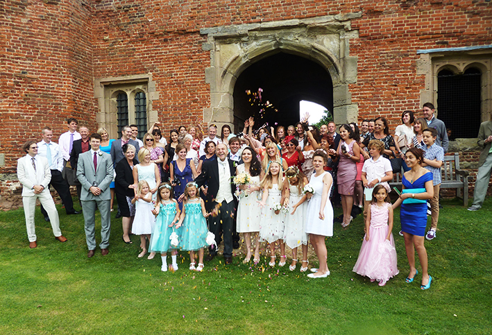 Tivemos muita sorte de encontrar um lugar perfeito. Eu adoro ruínas e amo castelos. Pois o Kirby Muxloe Castle é exatamente isso: ruínas de um castelo. É uma dos edifícios mais antigos da Inglaterra (1480). E ainda fica exatamente na cidade natal do Chris, a 5 minutos de onde residem os pais deles atualmente. Além disso, pagamos apenas o direito de fotografias (75 libras, cerca de 250 reais). Com isso, todos os convidados entraram grátis na ruína e foi possível realizar uma breve cerimônia!!!! Em frente ao castelo há um hotel/pub, com salão de festas. Então foi ideal: uma cerimônia no castelo e depois todos fomos para festa em frente.