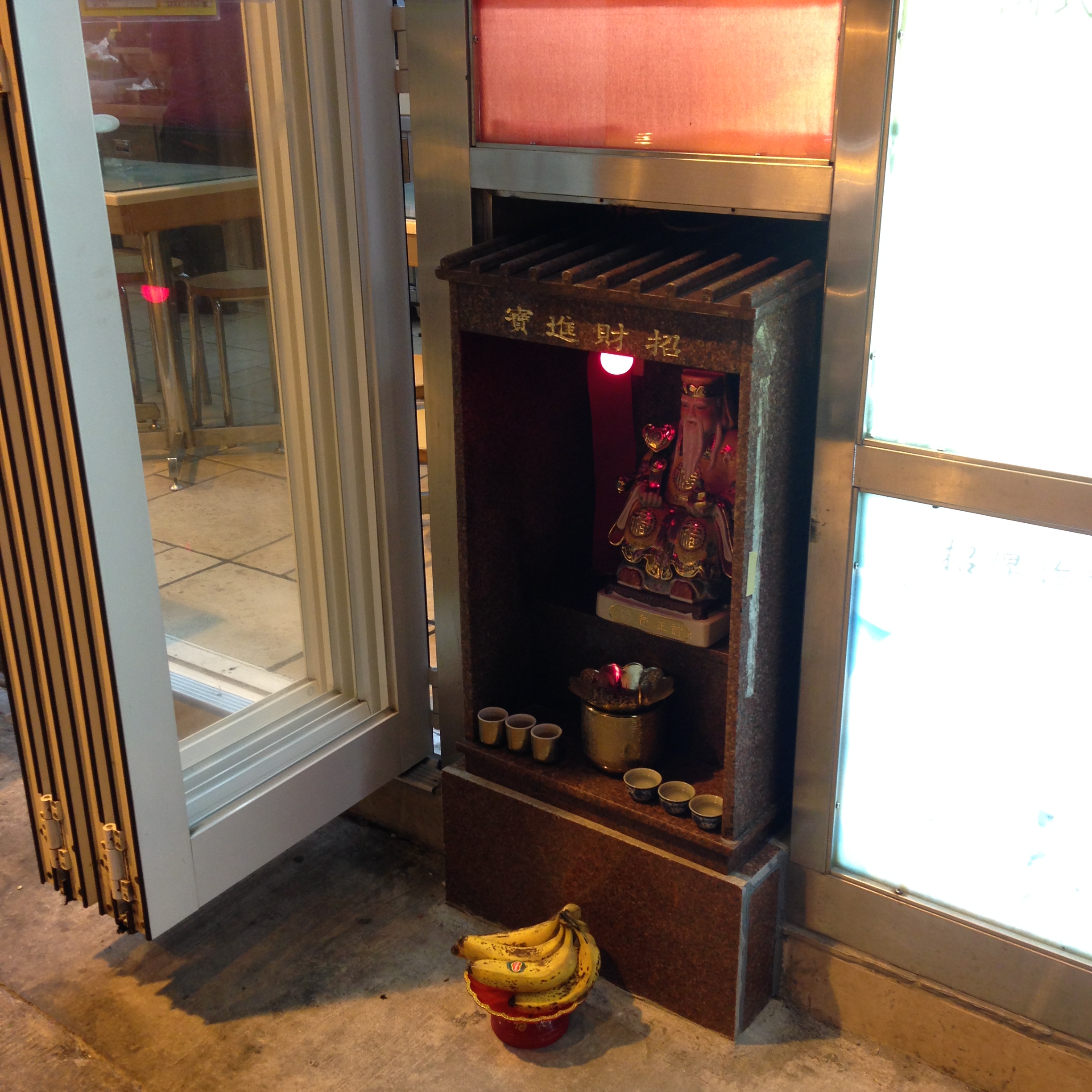 Diversos donos de comércio (restaurantes, lojas, imobiliárias, qualquer negócio) possuem altares no chão, ao lado da porta, com imagem de alguma entidade. Em busca de agradá-la para que o negócio prospere, eles colocam oferendas de comida e incenso. Sempre me pergunto quem afinal come as oferendas.