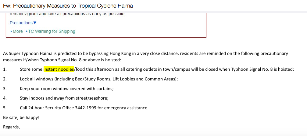 O mais engraçado foi um e-mail da universidade, com recomendações no dia anterior: estoquem macarrão instanteneo (noodles)/comida. Hahaha esses chineses são fissurados em noodles.