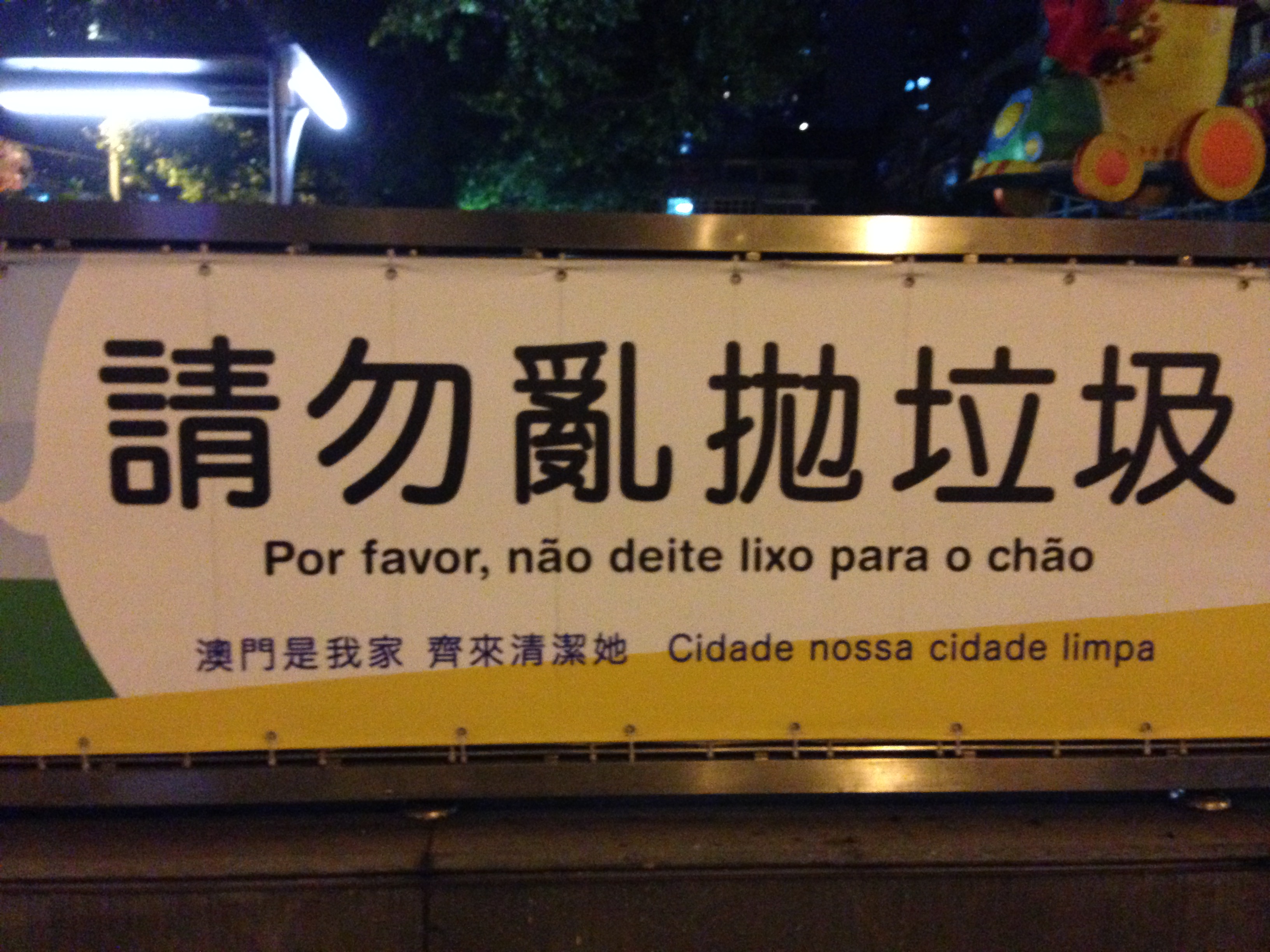 Macau é uma região administrativa especial da China que está a uma hora de Hong Kong de ferry boat. Antes de eu conhecer a cidade, as pessoas em Hong Kong me diziam para não esperar muito, que não era muito bonita. Geralmente quando vamos com baixa expectativa é que nos surpreendemos positivamente, pois achei Macau interessante e divertida. Especialmente para nós brasileiros, porque dá para nos sentirmos um pouco em casa. Macau foi colonizada pelos portugueses, de meados do século 16 até 1999. Como português e chinês são as línguas oficiais, todas as informações públicas, como sinalização e cartazes, estão em ambas as línguas. Essa mistura por si só é curiosa, ainda mais para quem não está acostumado ao português de Portugal. Por exemplo, o cartaz abaixo pede para não “deitar” o lixo no chão.